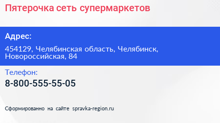 Пятерочка, сеть супермаркетов по адресу 454129, Челябинская область, Челябинск, Новороссийская, 84 в дальнейшем Организация, размещена в следующих категориях: