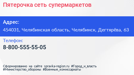 Пятерочка, сеть супермаркетов по адресу 454031, Челябинская область, Челябинск, Дегтярёва, 63 в дальнейшем Организация, размещена в следующих категориях: