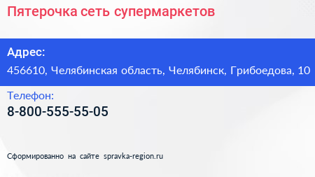 Пятерочка, сеть супермаркетов по адресу 456610, Челябинская область, Челябинск, Грибоедова, 10 в дальнейшем Организация, размещена в следующих категориях: