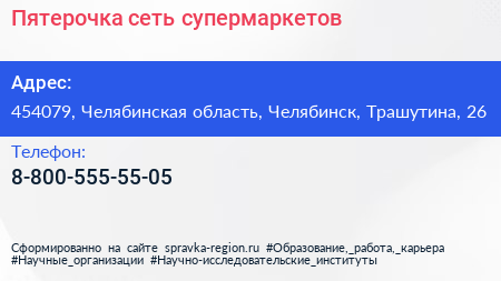 Пятерочка, сеть супермаркетов по адресу 454079, Челябинская область, Челябинск, Трашутина, 26 в дальнейшем Организация, размещена в следующих категориях: