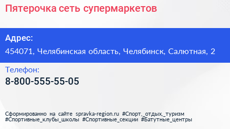 Пятерочка, сеть супермаркетов по адресу 454071, Челябинская область, Челябинск, Салютная, 2 в дальнейшем Организация, размещена в следующих категориях:
