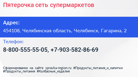 Пятерочка, сеть супермаркетов по адресу 454108, Челябинская область, Челябинск, Гагарина, 2 в дальнейшем Организация, размещена в следующих категориях: