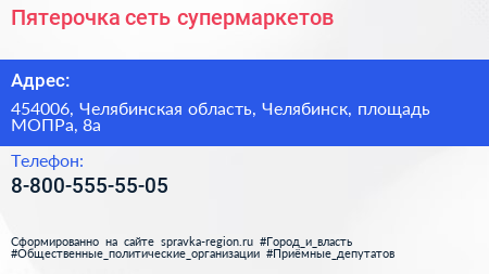 Пятерочка, сеть супермаркетов по адресу 454006, Челябинская область, Челябинск, площадь МОПРа, 8а в дальнейшем Организация, размещена в следующих категориях: