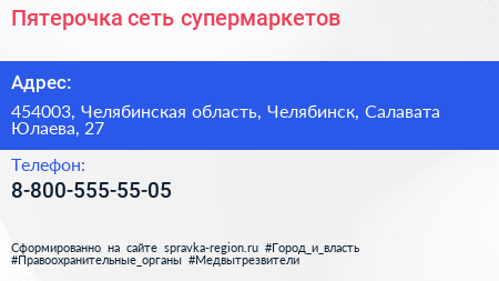 Пятерочка, сеть супермаркетов по адресу 454003, Челябинская область, Челябинск, Салавата Юлаева, 27 в дальнейшем Организация, размещена в следующих категориях: