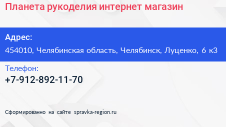 Планета рукоделия, интернет-магазин по адресу 454010, Челябинская область, Челябинск, Луценко, 6 к3 в дальнейшем Организация, размещена в следующих категориях: