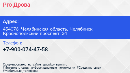 Pro Дрова по адресу 454076, Челябинская область, Челябинск, Краснопольский проспект, 34 в дальнейшем Организация, размещена в следующих категориях: