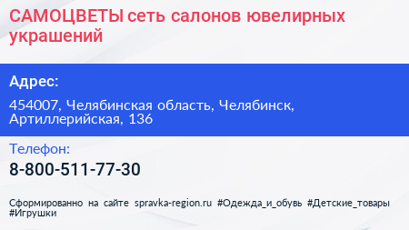 САМОЦВЕТЫ, сеть салонов ювелирных украшений по адресу 454007, Челябинская область, Челябинск, Артиллерийская, 136 в дальнейшем Организация, размещена в следующих категориях: