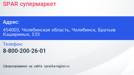 SPAR, супермаркет по адресу 454003, Челябинская область, Челябинск, Братьев Кашириных, 133 в дальнейшем Организация, размещена в следующих категориях: