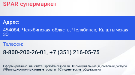 SPAR, супермаркет по адресу 454084, Челябинская область, Челябинск, Кыштымская, 30 в дальнейшем Организация, размещена в следующих категориях: