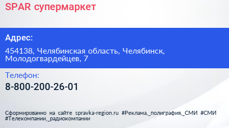 SPAR, супермаркет по адресу 454138, Челябинская область, Челябинск, Молодогвардейцев, 7 в дальнейшем Организация, размещена в следующих категориях: