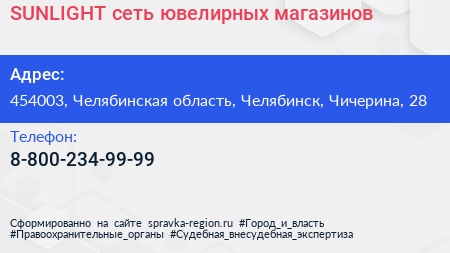 SUNLIGHT, сеть ювелирных магазинов по адресу 454003, Челябинская область, Челябинск, Чичерина, 28 в дальнейшем Организация, размещена в следующих категориях: