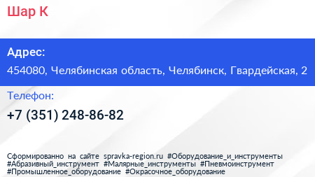 Шар & К по адресу 454080, Челябинская область, Челябинск, Гвардейская, 2 в дальнейшем Организация, размещена в следующих категориях: