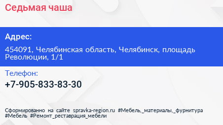 Седьмая чаша по адресу 454091, Челябинская область, Челябинск, площадь Революции, 1/1 в дальнейшем Организация, размещена в следующих категориях: