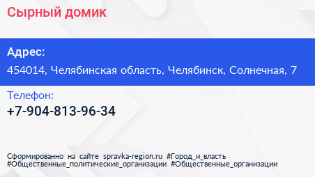 Сырный домик по адресу 454014, Челябинская область, Челябинск, Солнечная, 7 в дальнейшем Организация, размещена в следующих категориях: