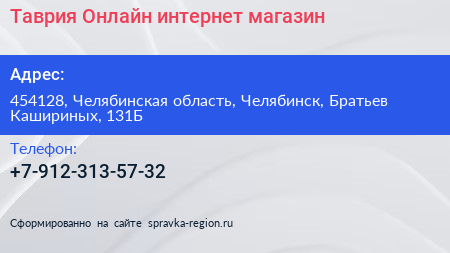 Таврия Онлайн, интернет-магазин по адресу 454128, Челябинская область, Челябинск, Братьев Кашириных, 131Б в дальнейшем Организация, размещена в следующих категориях: