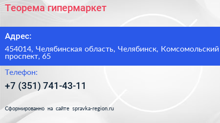 Теорема, гипермаркет по адресу 454014, Челябинская область, Челябинск, Комсомольский проспект, 65 в дальнейшем Организация, размещена в следующих категориях: