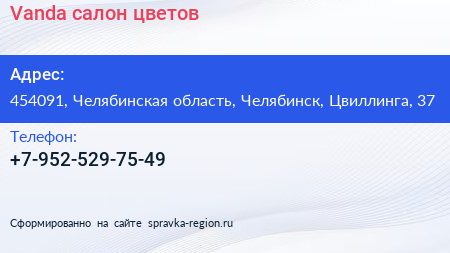 Vanda, салон цветов по адресу 454091, Челябинская область, Челябинск, Цвиллинга, 37 в дальнейшем Организация, размещена в следующих категориях: