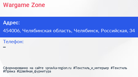Wargame Zone по адресу 454006, Челябинская область, Челябинск, Российская, 34 в дальнейшем Организация, размещена в следующих категориях: