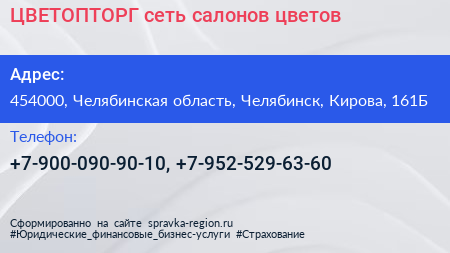 ЦВЕТОПТОРГ, сеть салонов цветов по адресу 454000, Челябинская область, Челябинск, Кирова, 161Б в дальнейшем Организация, размещена в следующих категориях: