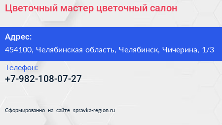 Цветочный мастер, цветочный салон по адресу 454100, Челябинская область, Челябинск, Чичерина, 1/3 в дальнейшем Организация, размещена в следующих категориях:
