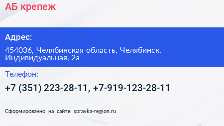 АБ-крепеж по адресу 454036, Челябинская область, Челябинск, Индивидуальная, 2а в дальнейшем Организация, размещена в следующих категориях: