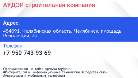 АУДЭР, строительная компания по адресу 454091, Челябинская область, Челябинск, площадь Революции, 7а в дальнейшем Организация, размещена в следующих категориях: