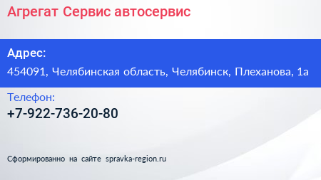 Агрегат-Сервис, автосервис по адресу 454091, Челябинская область, Челябинск, Плеханова, 1а в дальнейшем Организация, размещена в следующих категориях: