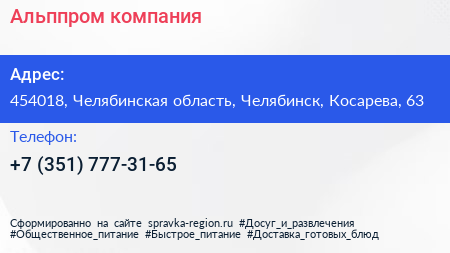 Альппром, компания по адресу 454018, Челябинская область, Челябинск, Косарева, 63 в дальнейшем Организация, размещена в следующих категориях: