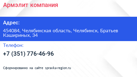 Армэлит, компания по адресу 454084, Челябинская область, Челябинск, Братьев Кашириных, 34 в дальнейшем Организация, размещена в следующих категориях: