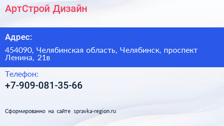 АртСтрой-Дизайн по адресу 454090, Челябинская область, Челябинск, проспект Ленина, 21в в дальнейшем Организация, размещена в следующих категориях: