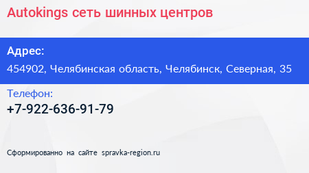 Autokings, сеть шинных центров по адресу 454902, Челябинская область, Челябинск, Северная, 35 в дальнейшем Организация, размещена в следующих категориях: