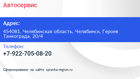 Автосервис по адресу 454081, Челябинская область, Челябинск, Героев Танкограда, 20/4 в дальнейшем Организация, размещена в следующих категориях: