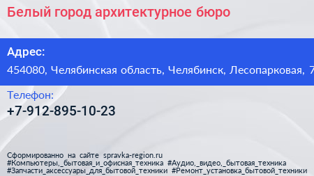 Белый город, архитектурное бюро по адресу 454080, Челябинская область, Челябинск, Лесопарковая, 7 в дальнейшем Организация, размещена в следующих категориях: