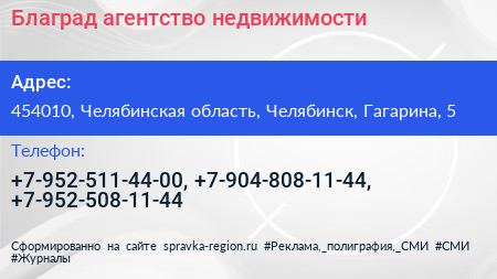 Блаград, агентство недвижимости по адресу 454010, Челябинская область, Челябинск, Гагарина, 5 в дальнейшем Организация, размещена в следующих категориях: