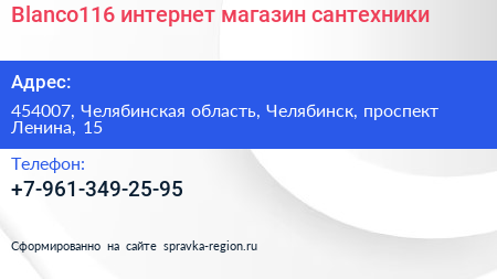 Blanco116, интернет-магазин сантехники по адресу 454007, Челябинская область, Челябинск, проспект Ленина, 15 в дальнейшем Организация, размещена в следующих категориях: