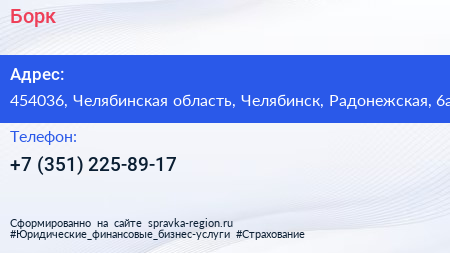 Борк по адресу 454036, Челябинская область, Челябинск, Радонежская, 6а в дальнейшем Организация, размещена в следующих категориях: