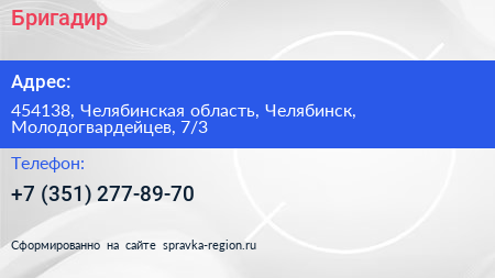 Бригадир по адресу 454138, Челябинская область, Челябинск, Молодогвардейцев, 7/3 в дальнейшем Организация, размещена в следующих категориях: