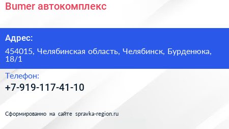Bumer, автокомплекс по адресу 454015, Челябинская область, Челябинск, Бурденюка, 18/1 в дальнейшем Организация, размещена в следующих категориях: