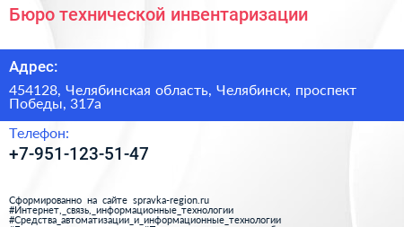 Бюро технической инвентаризации по адресу 454128, Челябинская область, Челябинск, проспект Победы, 317а в дальнейшем Организация, размещена в следующих категориях: