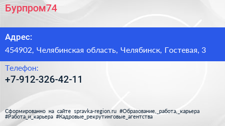 Бурпром74 по адресу 454902, Челябинская область, Челябинск, Гостевая, 3 в дальнейшем Организация, размещена в следующих категориях: