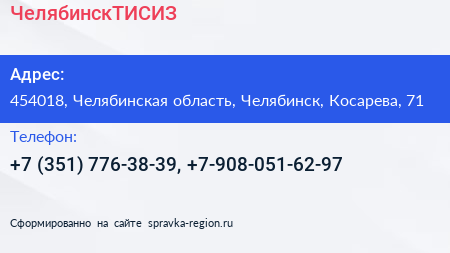 ЧелябинскТИСИЗ по адресу 454018, Челябинская область, Челябинск, Косарева, 71 в дальнейшем Организация, размещена в следующих категориях: