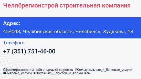 Челябрегионстрой, строительная компания по адресу 454048, Челябинская область, Челябинск, Худякова, 18 в дальнейшем Организация, размещена в следующих категориях: