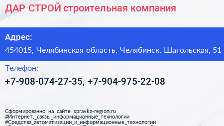 ДАР-СТРОЙ, строительная компания по адресу 454015, Челябинская область, Челябинск, Шагольская, 51 в дальнейшем Организация, размещена в следующих категориях: