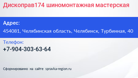 Дископрав174, шиномонтажная мастерская по адресу 454081, Челябинская область, Челябинск, Турбинная, 40 в дальнейшем Организация, размещена в следующих категориях: