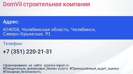 DomVil, строительная компания по адресу 454018, Челябинская область, Челябинск, Северо-Крымская, 91 в дальнейшем Организация, размещена в следующих категориях: