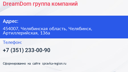 DreamDom, группа компаний по адресу 454007, Челябинская область, Челябинск, Артиллерийская, 136а в дальнейшем Организация, размещена в следующих категориях: