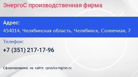 ЭнергоС, производственная фирма по адресу 454014, Челябинская область, Челябинск, Солнечная, 7 в дальнейшем Организация, размещена в следующих категориях: