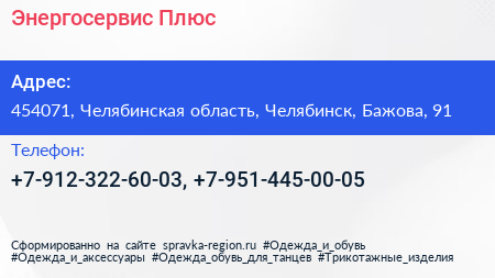 Энергосервис Плюс по адресу 454071, Челябинская область, Челябинск, Бажова, 91 в дальнейшем Организация, размещена в следующих категориях: