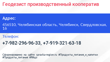 Геодезист, производственный кооператив по адресу 456510, Челябинская область, Челябинск, Свердловская, 16 в дальнейшем Организация, размещена в следующих категориях: