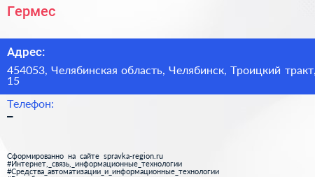 Гермес по адресу 454053, Челябинская область, Челябинск, Троицкий тракт, 15 в дальнейшем Организация, размещена в следующих категориях: